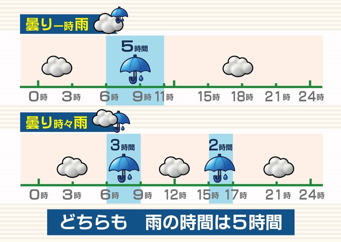初めに説明した「曇り一時雨」と「曇り時々雨」となるケースを並べると「どちらも雨が降った時間は5時間で同じ」ということになるため、一概にどちらの方が雨の時間が長い短いということはできないのです。