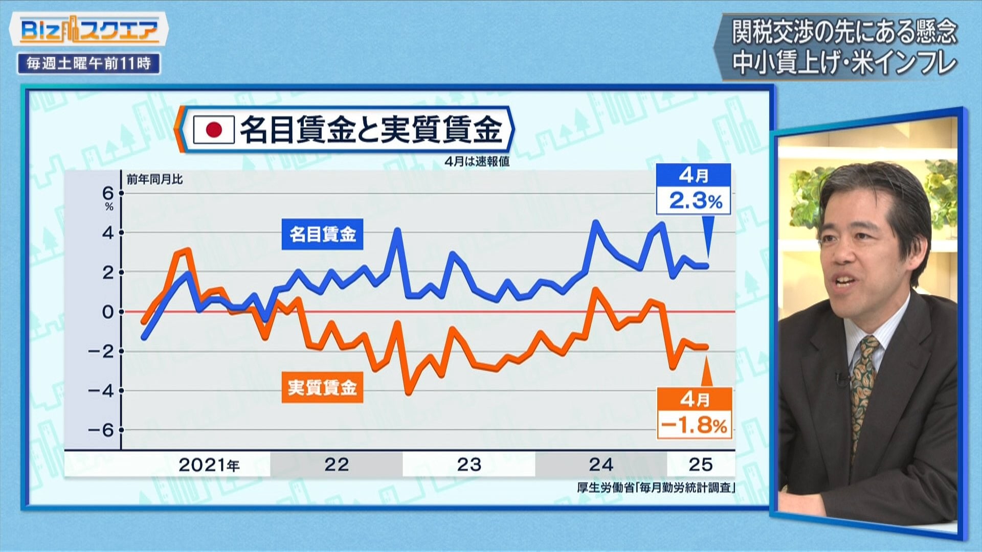 「賃金は上がっているが物価が上がりすぎている。日銀は2%と言っているが、実質賃金を計算する前提となる物価は4%。これはちょっとあり得ない。日銀が物価を安定させるという使命を果たし<利上げで円高>にすればいいのだが、トランプ関税がある今、利上げをすると企業収益自体がポキッと腰折れしてしまう。企業収益を重視するのか、利上げして物価安定に舵を切るのか。日銀はジレンマに苦しんでいると思う」