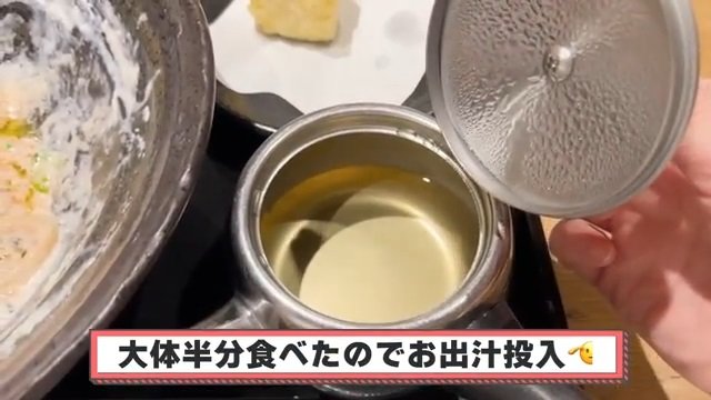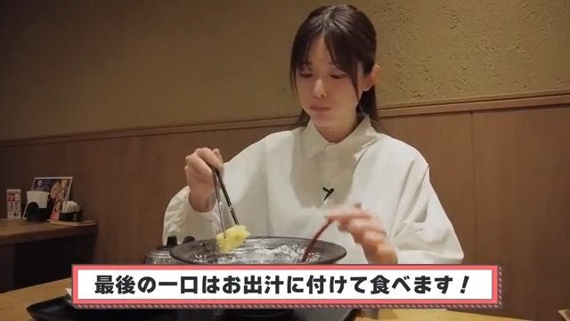 「カマンベールチーズ天も美味しっ!」と堪能する松村さんは、いつもの通り “一滴も飛ばさない” 丁寧な箸運びでうどんを半分まで食べ進め、店員さんからの説明の通りに、添えてある「お出汁」をうどんの丼に注いて、味変に挑戦。「なるほど!これは面白い!」「全然違う感じのおうどんになりますね!」と、さらに感嘆。どんどん食べすすめ、ついにうどんを食べきった松村さんは、残ったお出汁にカマンベールチーズ天の最後の一口を浸して平らげ「美味しい…!」と天を仰ぎます。