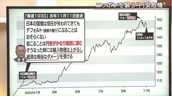 宮沢議員は、1年前に当番組に出演し、「円安が進行し物価が上がり日本経済は相当なダメージを受ける」と予測したが、その時「それでも日本の国債がデフォルト(債務不履行)になることはない」と語った。その考えは今も変わらないのだろうか。