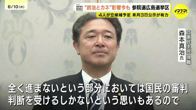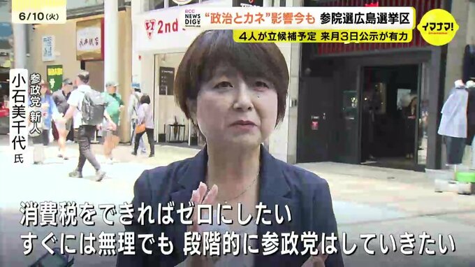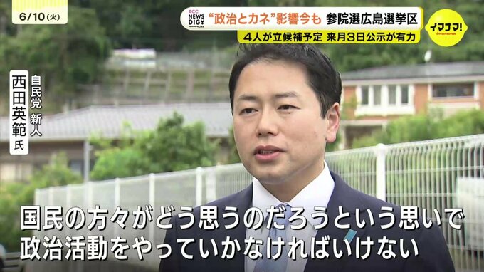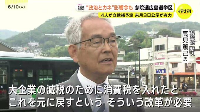 10日の深掘りNEWSDIGは来月3日公示、20日投開票が有力とされている参議院選挙についてです。広島選挙区では現時点で4人が立候補を予定していますが、大規模買収事件など「政治とカネ」の問題の影響は、今も続いています。