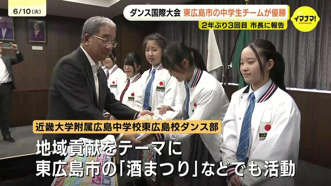 アメリカで開かれたダンスの国際大会で「中学生のHIPHOP部門」の1位になった東広島市の中学生ダンスチームが高垣市長に優勝を報告しました。優勝を報告したのは近畿大学附属広島中学校東広島校ダンス部の大会選抜…