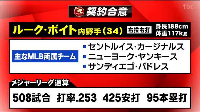 【楽天】メジャーリーグで95発 ルーク・ボイト選手と契約合意 右の大砲として活躍 東北放送 2025年6月10日(火) 19:05 国内 交流戦を戦う楽天イーグルスに新たな助っ人が加わります。メジャーリーグで95発を放った実績を持つルーク・ボイト選手と契約合意に至ったと発表されました。 実績は十分、右の大砲としての活躍が期待されます。
