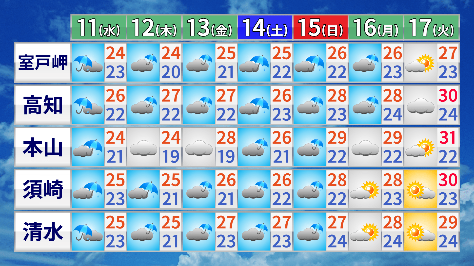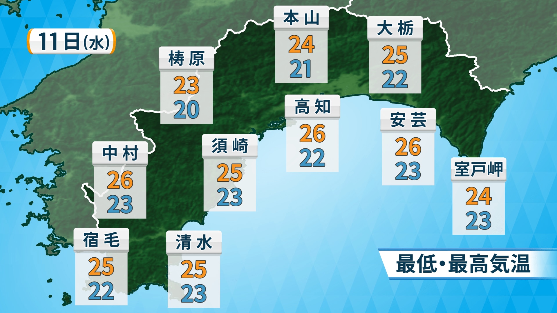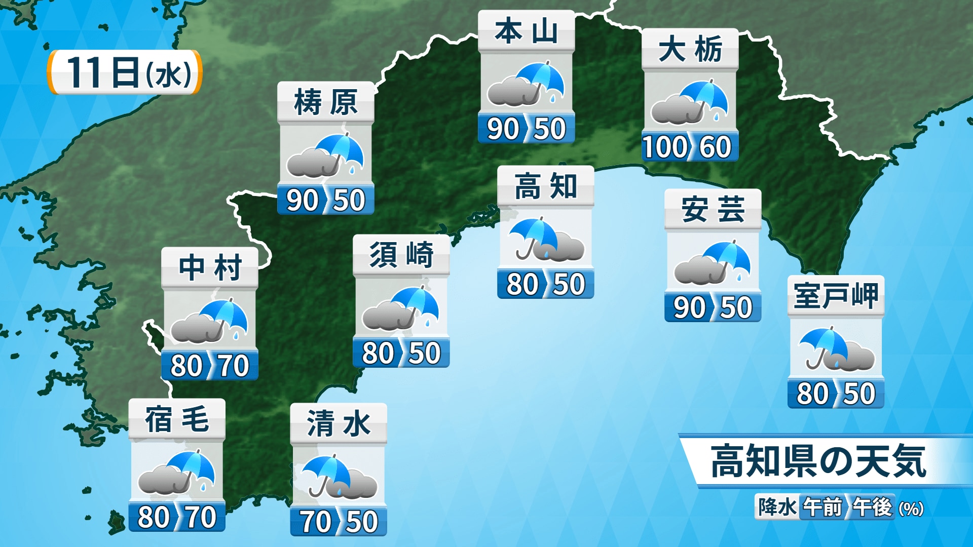 11日の高知県内は梅雨前線の影響で暖かく湿った空気が流れ込み、雨の強まるところがありそうです。