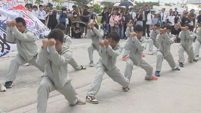 9日は見送りの在校生たちが、沖縄水産伝統の踊りで出航にエールを送りました。