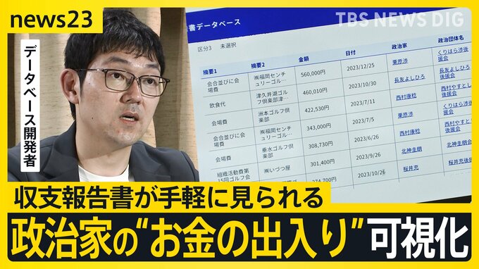 ある民間の人が政治家のお金の出入りを可視化するサイトをつくりました。政治と一見、関係ないように見える夜のお店での支出も分かるように。制作したワケを聞きました。国会の会期末まであと10日あまりとなる中、1…