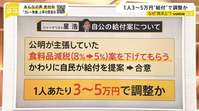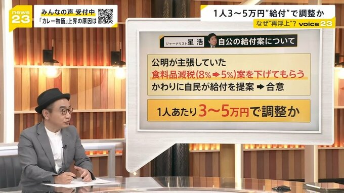 これについて、ジャーナリストの星浩さんに聞きました。公明党が主張していた食料品の減税案(8%→5%)を下げてもらう代わりに、自民党が給付案を提案して合意した。このようなことが背景の一つにあるのではないかと、星さんはみています。