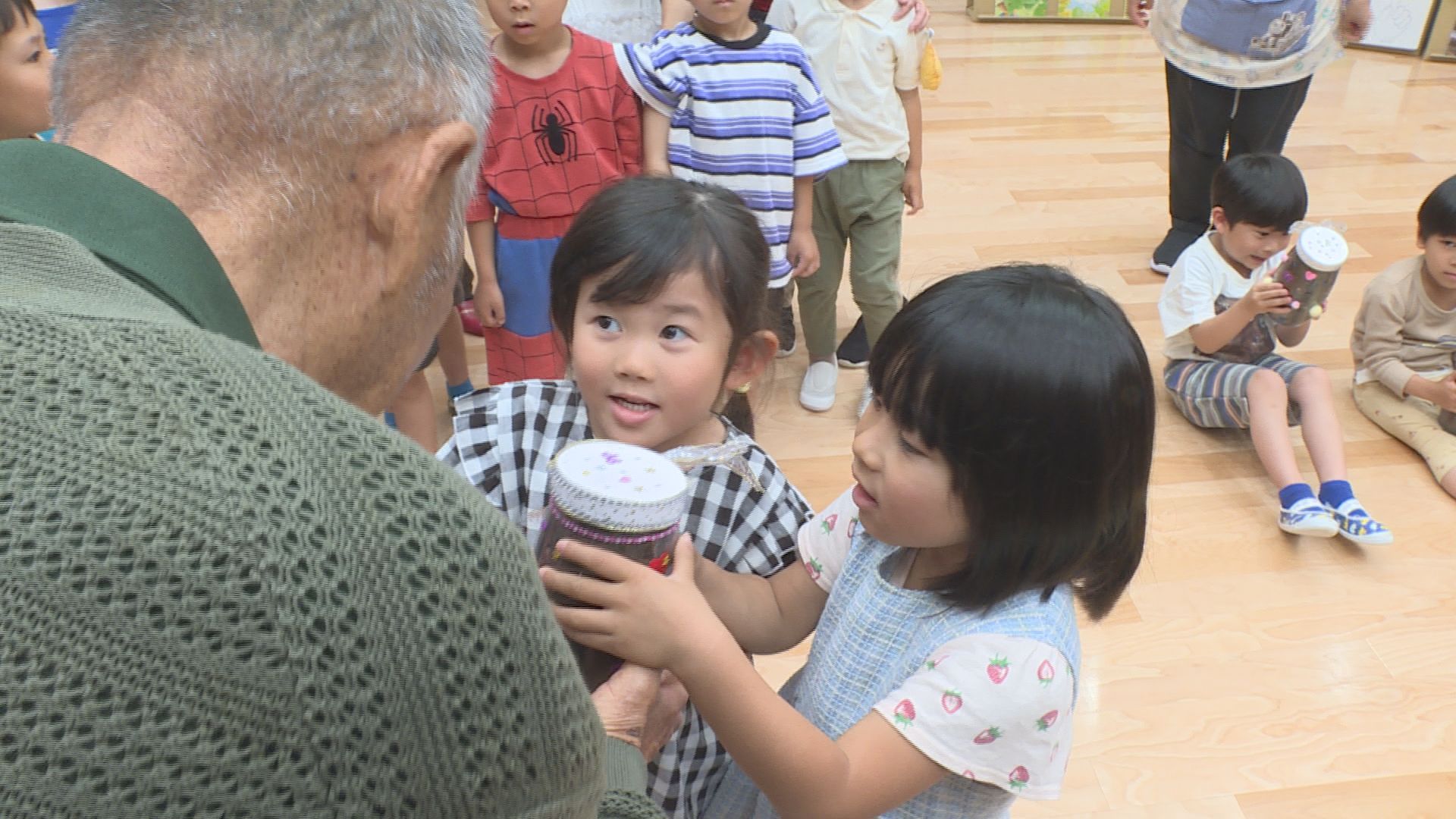 利用者が小野田めぐみ幼稚園の園児13人に8匹のサナギを贈りました。みつば園では33年前から利用者や職員がカブトムシを育てていて、毎年、サナギをプレゼントしています。