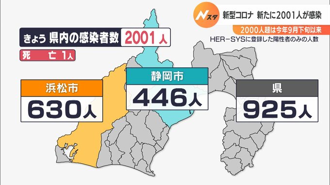 静岡県内では、きょう新たに2001人が新型コロナウイルスに感染しました。新規感染者数が2000人を超えるのは今年9月下旬以来です。2001人の感染者のうち浜松市が630人、静岡市が446人です。浜松市では、感染した高…