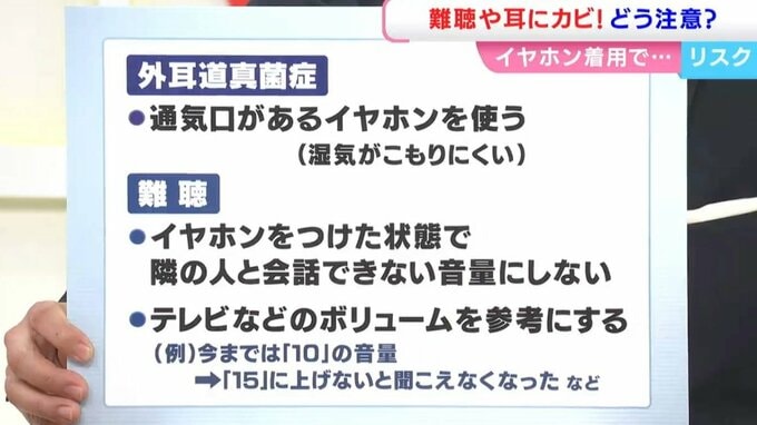 假谷医師によると、イヤホンを着用する「時間」についての注意点は、個人差もあるので明確に「何時間」という線引きは難しいとしていますが、“外耳道真菌症”については、時間が長くなれば必然的にリスクが増えるということです。