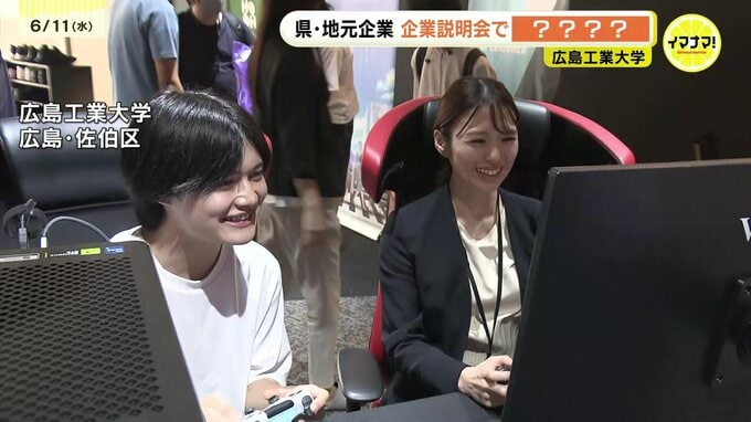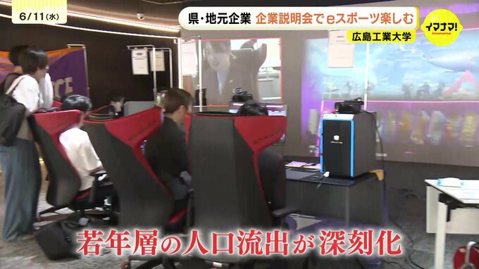 県が進めるまちづくりプロジェクトの一環として広島工業大学で開催。マツダや広島ガス、サンフレッチェといった地元企業などが、学生たちと一緒にeスポーツを楽しみながら和やかな雰囲気の中で業務内容について話していました。