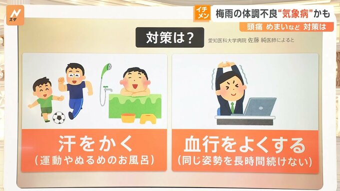 “気象病”の対策として、▼汗をかく(運動やぬるめのお風呂)、▼血行をよくする(同じ姿勢を長時間続けない)といったことが大事だといいます。