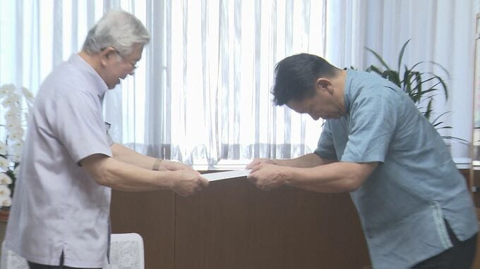 市長会会長を務める中山義隆石垣市長ら3人は11日県庁を訪れ、県が来年度からの導入を目指している宿泊税をめぐり、来週始まる予定の県議会6月定例会への条例案提出が見送られたことなどに抗議しました。一方で、修学旅行など学校教育に伴う宿泊には課税を免除することなどを求めました。