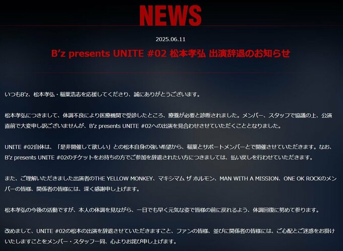 公式サイトでは「いつもB’z、松本孝弘・稲葉浩志を応援してくださり、誠にありがとうございます。」「松本孝弘につきまして、体調不良により医療機関で受診したところ、療養が必要と診断されました。メンバー、スタッフで協議の上、公演直前で大変申し訳ございませんが、B’z presents UNITE #02への出演を見合わせさせていただくこととなりました。」と、報告。