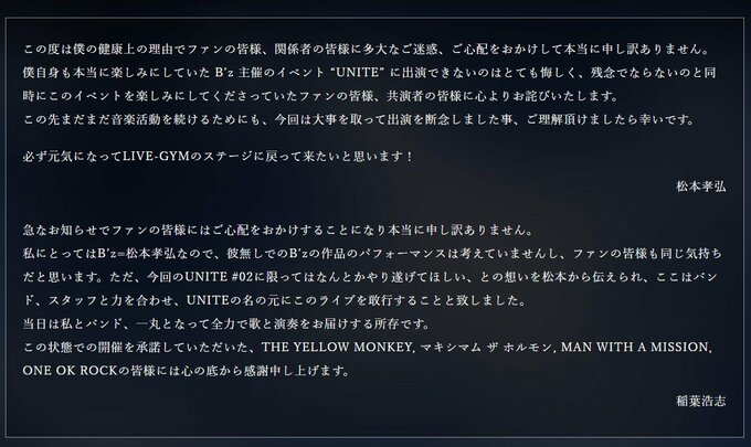 続けて「私にとってはB’z=松本孝弘なので、彼無しでのB’zの作品のパフォーマンスは考えていませんし、ファンの皆様も同じ気持ちだと思います。ただ、今回のUNITE #02に限ってはなんとかやり遂げてほしい、との想いを松本から伝えられ、ここはバンド、スタッフと力を合わせ、UNITEの名の元にこのライブを敢行することと致しました。」と、綴りました。