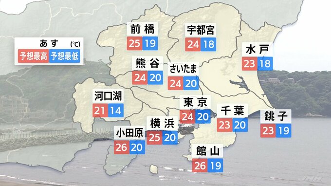 朝の気温は今朝と変わらず、20℃くらいでしょう。昼間はきょう(12日)よりも低くなりますが、湿度が高いため、蒸し暑く感じられそうです。
