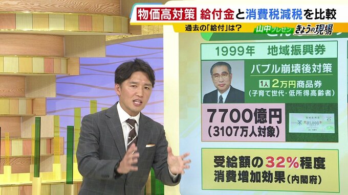 給付に似た政策として、1999年に地域振興券1人2万円分の商品券(7700億円)が配布されました。使用期限があって貯蓄しにくい仕組みでしたが、それでも消費を押し上げる効果は約32%に留まったといいます。なぜなら商品券が使われたため、本来使っていた現金を使わなかったと考えられています。2024年に行われた1人4万円の定額減税(3兆2840億円減税)について、みなさんは効果を実感していますでしょうか?