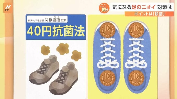 東海大学理学部・関根教授によると、10円玉を靴の中に2枚ずつ、つま先とかかとに置くだけで抗菌効果が期待できる「40円抗菌法」があるそうです。