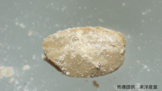 「成虫は、コメの表面のぬか部分を鼻の先でゴリゴリ削りながら食べるので、表面がボロボロになっていきます」【画像②:食害にあったコメ】