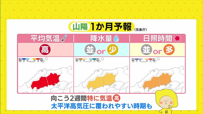 来週の前半にかけて梅雨前線の活動が活発になり、あさって土曜日はまとまった雨になる見込みです。雨脚が強まる時間帯があるでしょう。来週は上空に真夏の時期と同じような暖かい空気が入り、日中の気温は30℃を超える日が続く予想です。かなり蒸し暑くなるので熱中症には十分ご注意ください。この先、向こう2週間程度は太平洋高気圧の勢力が強まり、特に気温が高い傾向が続く見込みです。