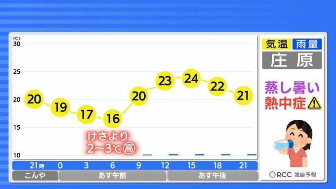 あす朝の気温は、けさと同じくらい~2.3℃高い所が多いでしょう。こんやも寝苦しい夜になる見込みです。日中の気温は25℃前後で、あすもムシッとした体感になるでしょう。