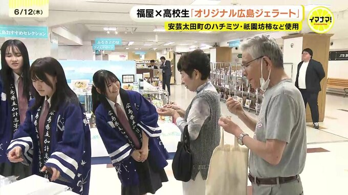 お中元商戦まっただ中ですが、デパートの福屋は初めて高校生とコラボした商品を発売しました。安芸太田町のハチミツや祇園坊柿を使ったジェラートです。福屋八丁堀本店で、来店客に試食を勧めているのは、商品開発…