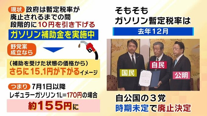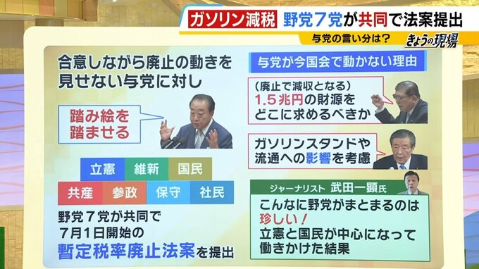今回の提出は、自民・公明・国民の3党が合意した暫定税率の廃止案が原点にあります。合意をしながらも具体的な動きを見せない与党に対し、立憲民主の野田代表が「踏み絵を踏ませる」と表現したように、野党7党が共同で7月1日開始の暫定税率廃止法案を提出しました。野党が与党に、「何してるの、早くしてくれ」と突きつけた、ということでしょう。