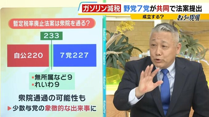 今後、暫定税率廃止法案は衆議院を通過するのか、というところが一つの肝になってきます。過半数233のうち、野党7党合わせて227ですので、無所属など9人とれいわ9人から6人獲得できれば、衆院通過の可能性も見えてきます。