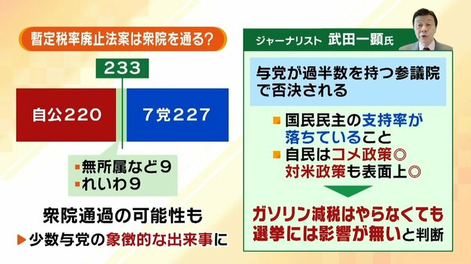 ただ先行きについては、「与党が過半数を持つ参議院で否決される可能性」があるとし、理由について、▼国民民主の支持率が落ちていること、▼自民は米政策がうまくいっていること、▼対アメリカ政策も表面上うまくいってるように見えるというプラスポイントがあるため、「ガソリン減税をやらなくても選挙には影響がない」と判断しているのではないかとみました。