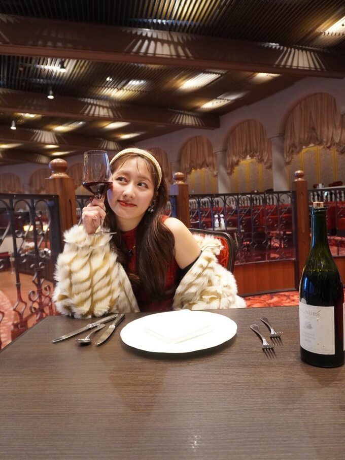佐々木さんは、レストランで赤ワインを注いだグラスを傾け、一緒にテーブルを囲んでいるかのような視線を送りながら、多彩な表情を見せています。