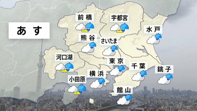 きょう(13日)、関東南部は午後も雲に覆われますが、薄日の差すところもあるでしょう。最高気温は、きのう(12日)より低く26度くらいの予想です。