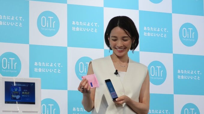 実際に「OiTr」を使用しているそうで、‟撮影現場で商業施設がロケ現場で使われている時に、「OiTr」が置いてるがあると安心感があるし、いいサービスだなって思います。個室にそれぞれ置いてあるのが素晴らしいのと、(ナプキンが出る時に)音が全然ならないんです。音が鳴るとナプキン取っているなって、気にするけど無音で出てくるのも優しさだし安心感があります”と、サービスを利用した感想を語りました。