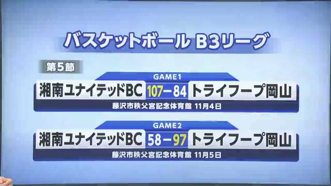 バスケットボールB3リーグのトライフープ岡山は、第5節、敵地で湘南ユナイテッドBCと戦い1勝1敗、現在リーグ1位につけています。次の試合は、12日と13日、ホーム津山市でベルテックス静岡を迎え撃ちます。