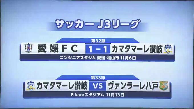 サッカーJ3のカマタマーレ讃岐はきのう(6日)アウェーで愛媛FCと対戦し引き分けました。今シーズンは残り2試合。次節は13日ホームでヴァンラーレ八戸を迎え撃ちます。