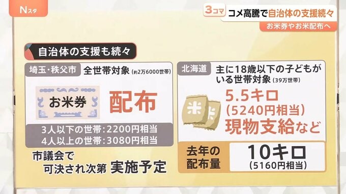 埼玉・秩父市では、全世帯(約2万6000世帯)を対象に、3人以下の世帯には2200円相当、4人以上の世帯には3080円相当の「お米券」を配布。市議会で可決され次第、実施予定ということになっています。