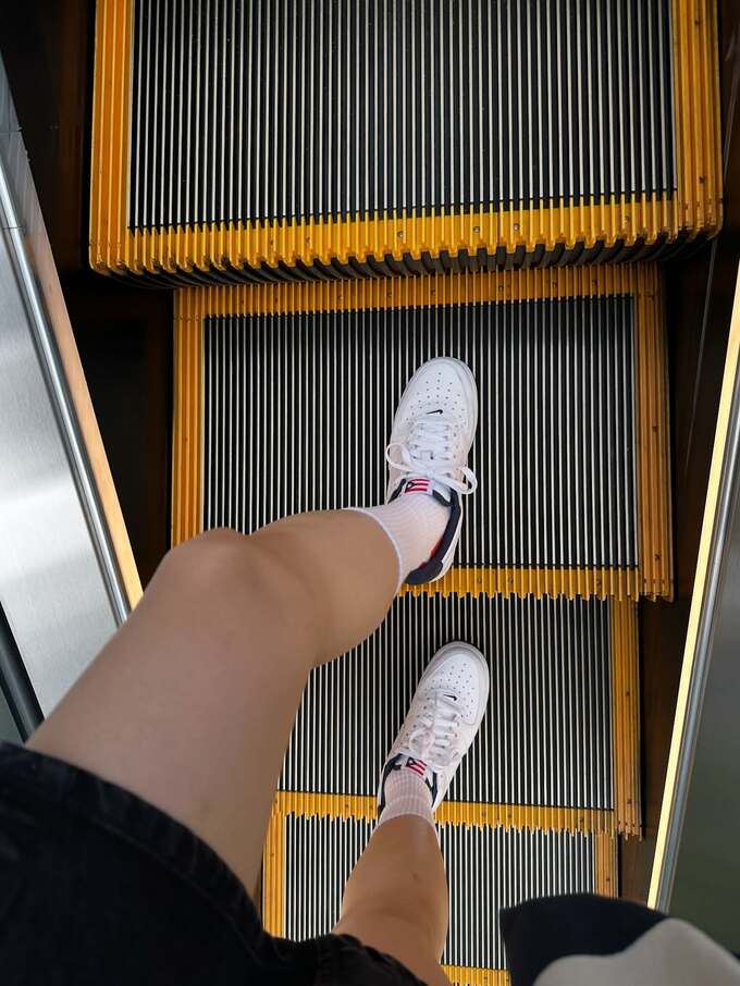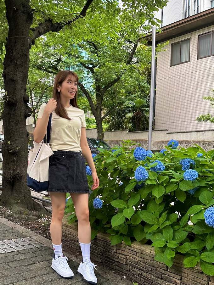 中川さんの足元には、タンの部分にプエルトリコの旗があしらってあって、白いシューズの中で際立っています。そんな中川さんは、薄いイエローのTシャツに黒のデニムのミニを合わせていて「カジュアル服すきです!」とコメント。