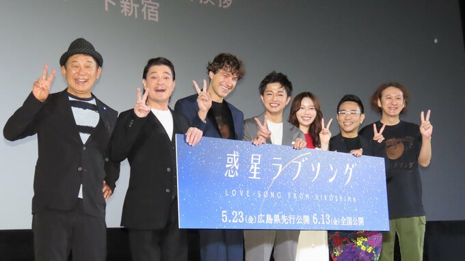 俳優の曽田陵介さんが主演を務めた映画『惑星ラブソング』の公開記念舞台挨拶が行われ、曽田さんとともに秋田汐梨さん、チェイス・ジーグラーさん、八嶋智人さん、川平慈英さんらが登壇しました。