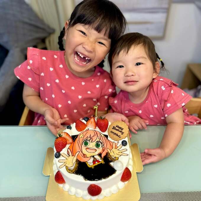 ののちゃんは、ひいちゃんとお揃いの濃いピンクの水玉模様の服を着てケーキを囲み、嬉しさのあまりに歓声を上げているような表情を見せています。そのケーキの上には、大人気コミック&アニメ作品のキャラクターが。
