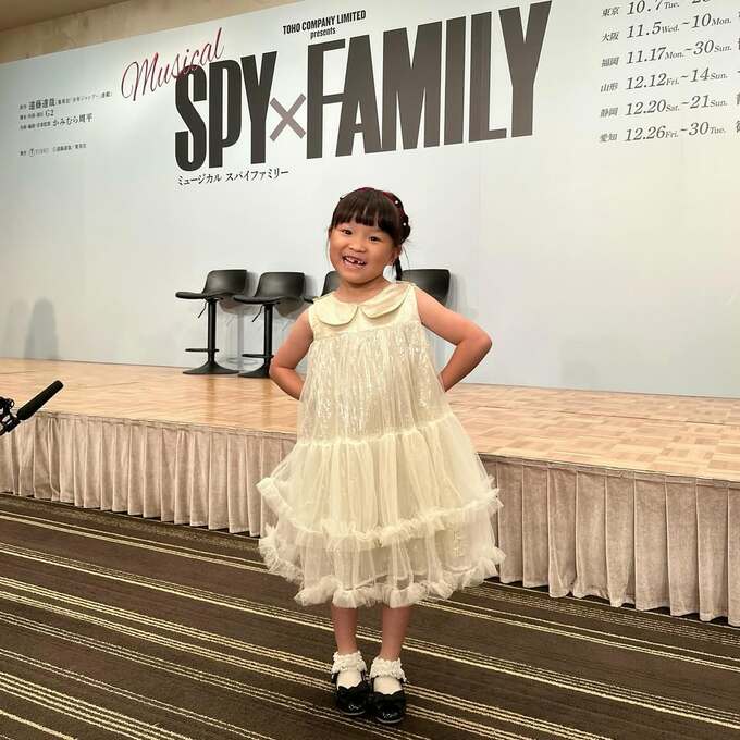 それは「SPYxFAMILY」の “アーニャ” 。アカウントでは「ミュージカルSPY×FAMILY ののちゃんがアーニャ役で出演します」と公表していて、投稿の1枚目ではののちゃんが白いワンピースで会見の舞台の前でポーズを取っています。