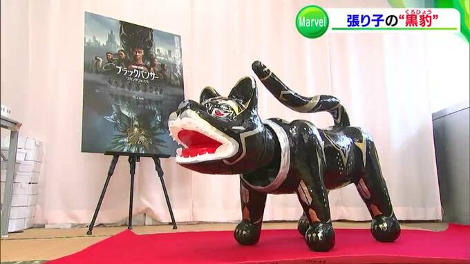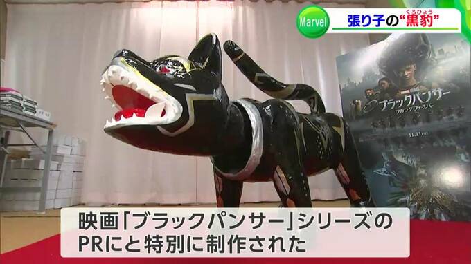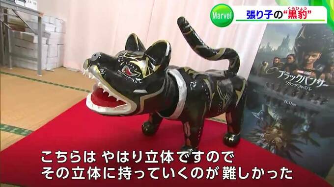 首を振る姿は張り子の虎。ただ、黒く染まった体に金銀の幾何学模様があしらわれています。張り子の黒豹…ブラックパンサーです。映画「ブラックパンサー・ワカンダフォーエバー」の公開を記念して特別に制作されました。張り子の真っ黒の精悍なボディは映画に登場するブラックパンサーのハイテクスーツをイメージしました。