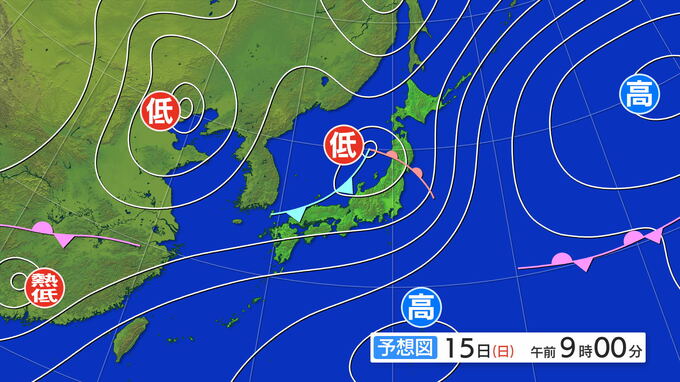 【大雨情報】15日(日)にかけて西日本や東日本は大雨のところも 北陸では15日未明に雨脚強まる見込み 全国の雨と風のシミュレーション 北陸放送 2025年6月14日(土) 19:06 国内 14日(土)の夜遅くから15日(日)にかけて、低気圧や前線の影響で、西日本や東日本では警報級の大雨になるところもあるでしょう。土砂災害などに警戒が必要です。 15日午前9時の予想天気図です。14日に梅雨前線上に発生した低気圧が東北の西の海上へと進む見込みです。 15日(日)午前9時の予想天気図 低気圧や前線に向かって暖かく湿った空気が流れ込み、西日本から東日本にかけて広い範囲で雨が降り、降り方が激しくなるところもありそうです。