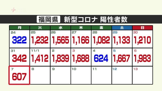 新型コロナの感染状況です。福岡県で607人、佐賀県で99人が新型コロナの検査で陽性だったと7日発表されました。◆3日連続で前週比アップ福岡県は、3日連続で前の週の同じ曜日を上回りました。80代以…