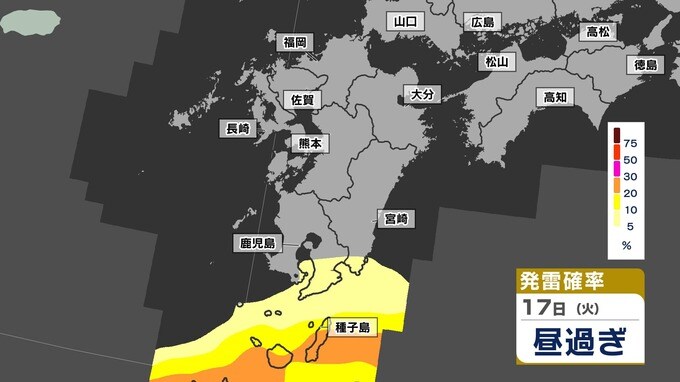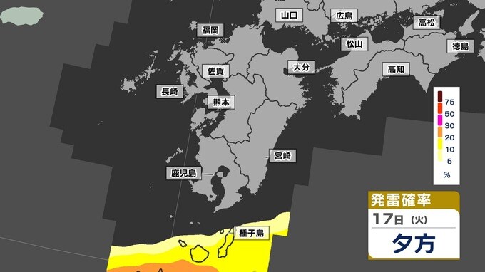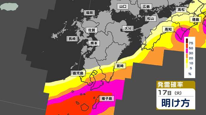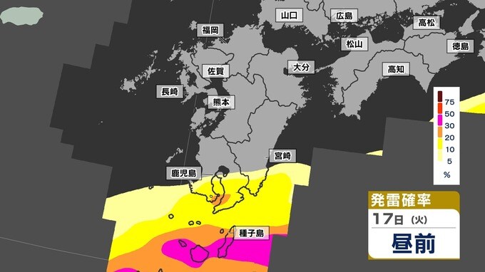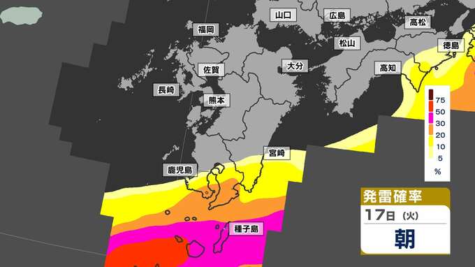【天気の急変注意】激しい雨 落雷 突風 に注意【雨と発雷確率のシミュレーション16日(月)】福岡・佐賀・長崎・大分・熊本・宮崎・鹿児島