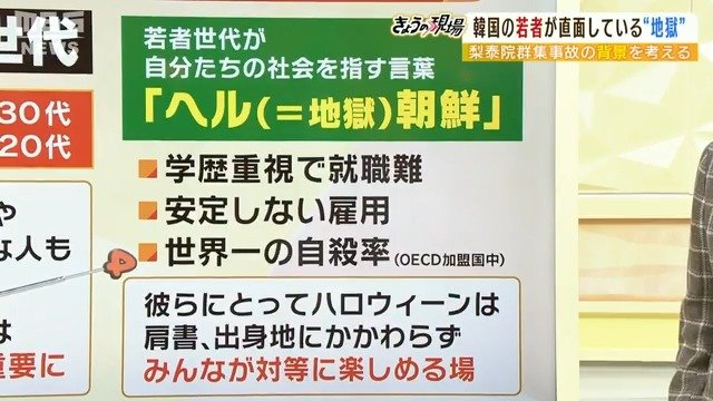 ―――若者世代は自分たちの社会を指す言葉として『ヘル(地獄)朝鮮』と言う言葉が出てきているようです。彼らが置かれてる状況は学歴重視で就職難、安定しない雇用、そして世界一の自殺率、ですからこの状況は地獄ということで、自虐的にこういう言葉があります。彼らにとってハロウィーンは、肩書き・出身地に関わらずみんなが対等に楽しめる場、そういう方がたくさんいたということですね。