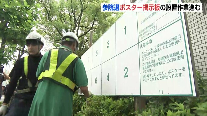 広島市中区の国泰寺公園では広島選挙区候補者用の掲示板が設置されました。広島市は7月1日までに市内2043か所で設置作業を進めます。3年前の前回の選挙の時より全市で投票所が2か所増えた関係で、設置場所は16か所多くなるということです。県選挙管理委員会によりますと前回の「広島選挙区」の投票率は過去3番目に低い46・79パーセントでした。