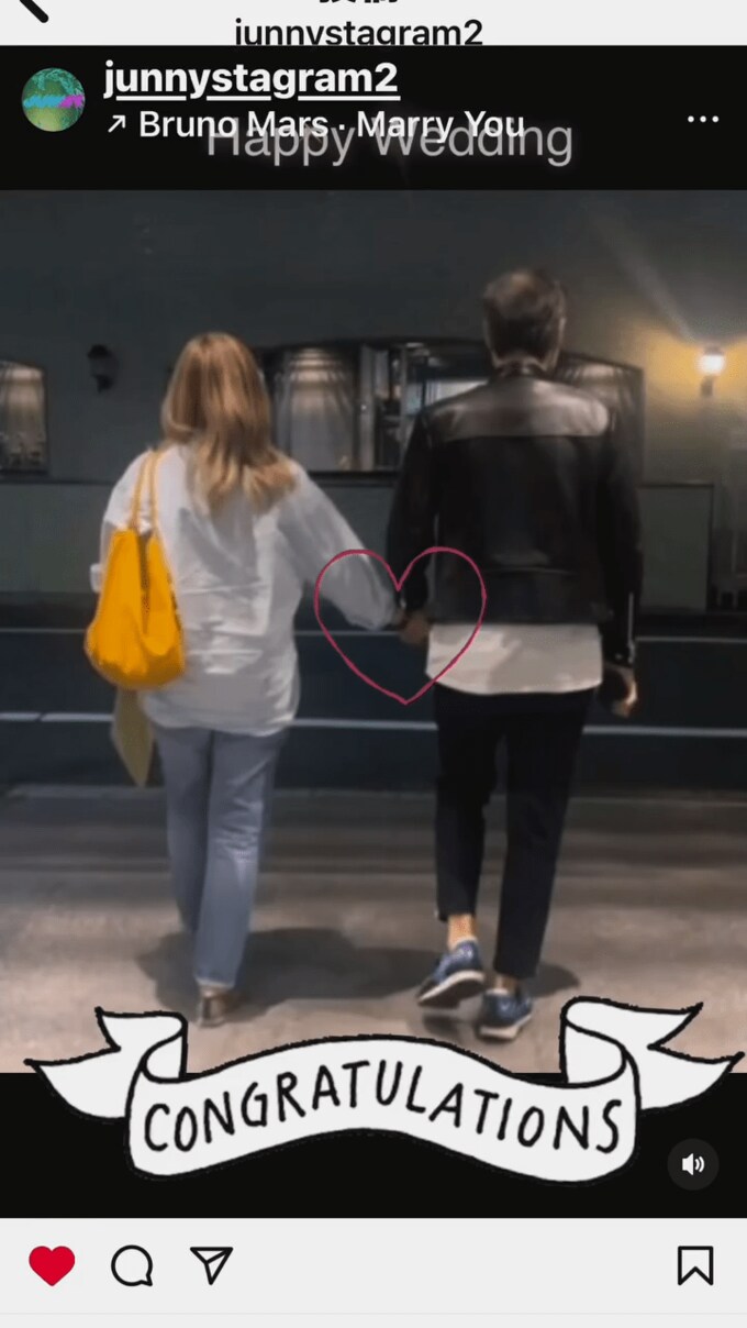 投稿はスライド形式で20枚ほどの写真を掲載。仲良く手をつないだりハグをしたりする初々しい新婚ショットを紹介しています。