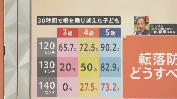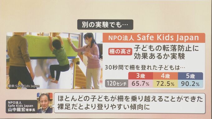 ではどうすれば転落を防止できるのでしょうか。NPO法人 Safe Kids Japan山中理事長によりますと「5歳以上になると柵を高くしても転落防止効果がほとんどない。10秒もあれば乗り越えてしまうので保護者の意識や行動に頼らない防止策が必要」と親御さんの見守りのない環境でも防止できるような物理的な対処が必要ということなんです。
