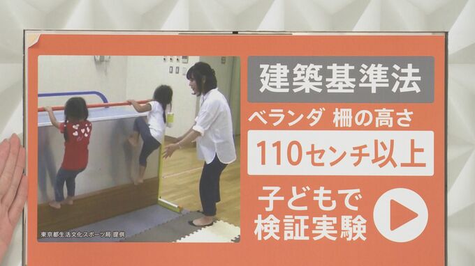 それでも防止策としては完全ではありません。現在の建築基準法でベランダの柵の高さは110センチ以上と定められています。この110センチ以上で東京都が実験を行いました。