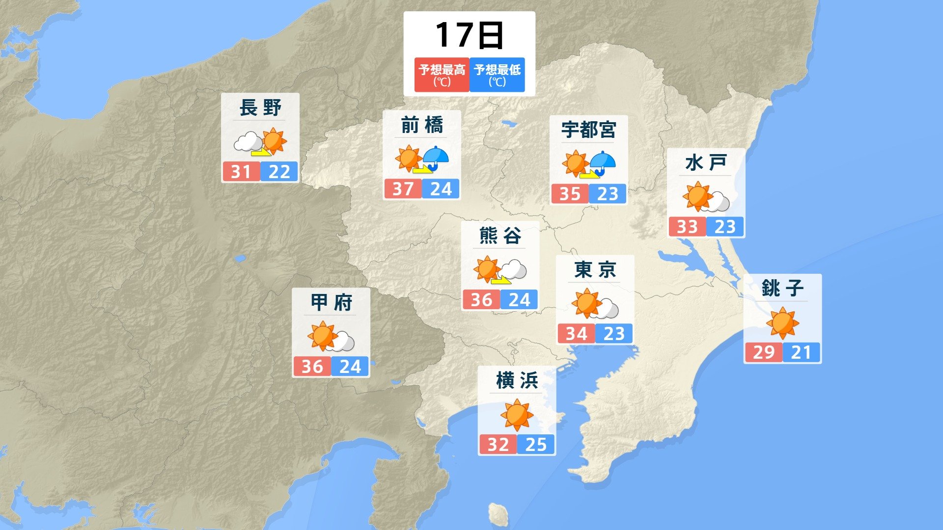 気象庁によりますと、関東甲信地方では17日午後は太平洋高気圧の縁をまわる暖かく湿った空気の流れ込みと日中の気温上昇の影響で、大気の状態が非常に不安定となる見込みです。