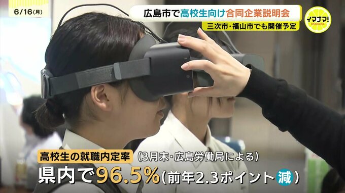 合同企業説明会には、県内を中心とした75の企業が出展し、260人の生徒が参加しました。広島労働局によりますと、この春卒業した高校生の就職内定率は96.5%で、前年の2.3ポイント減少しています。